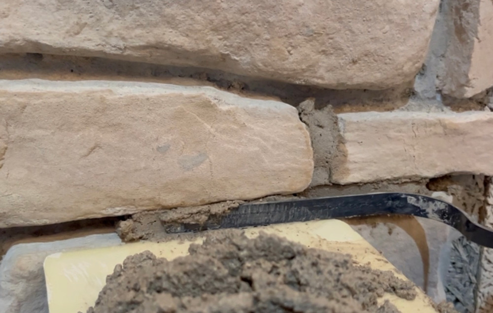 Apply using a hawk and appropriately sized tuck pointer. Ideally pull back on fresh mortar when applying i.e. if you’re right handed apply from the right side and work towards the left or vice versa if left handed. Leave sufficient time to finish with a churn brush the same day or the following day in cooler periods.