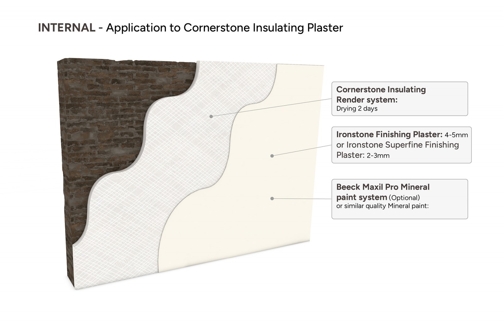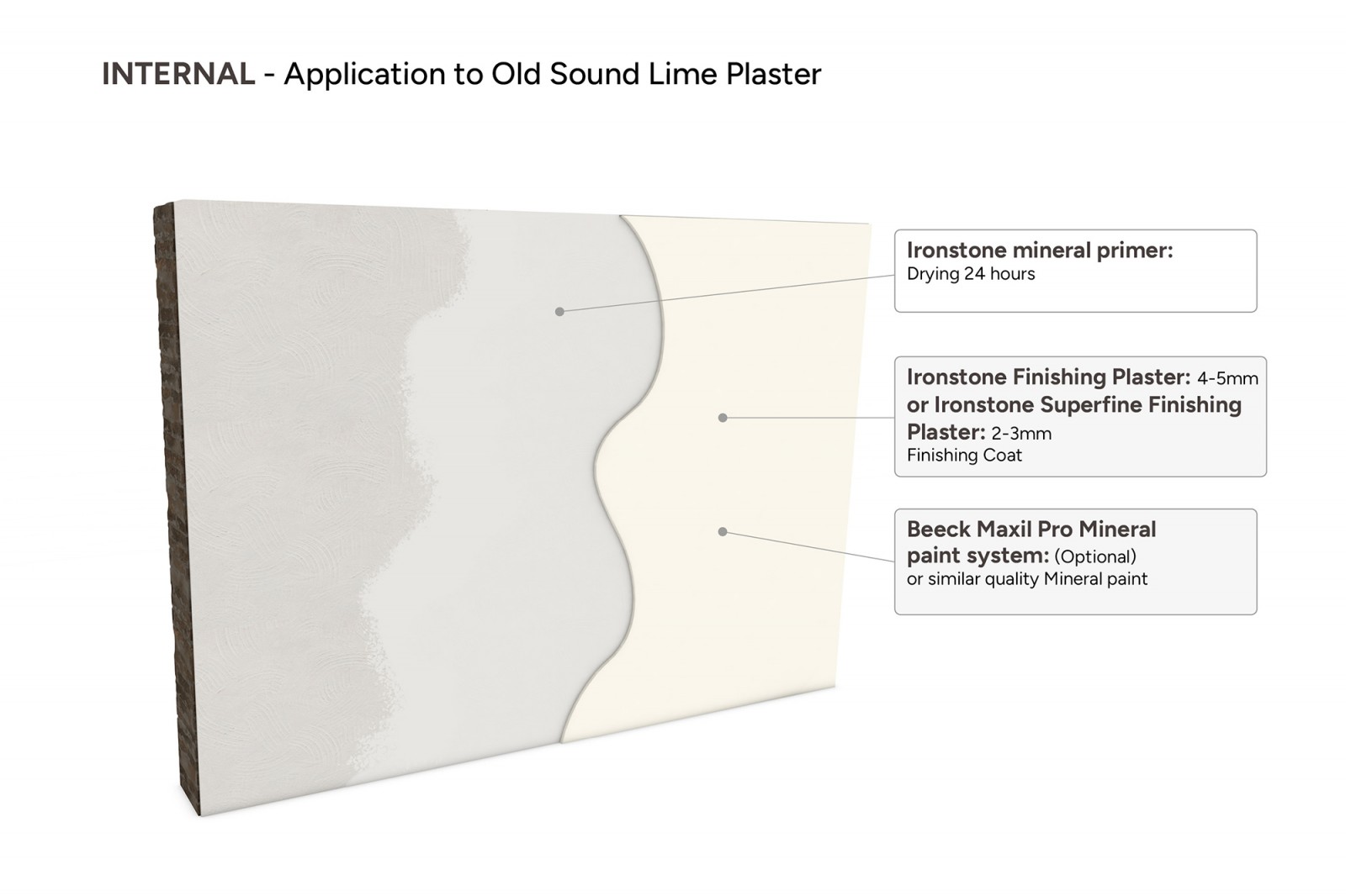 Our Ironstone Superfine Finishing Plaster is a topcoat plaster for application on Ironstone Basecoat Plaster, Cornerstone Insulating Plaster or sound old lime plaster.