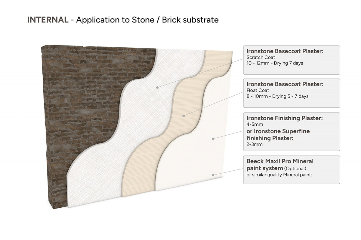 Our Ironstone Basecoat Plaster will be suitable for use onto masonry backgrounds with some suction. For application on to very smooth or highly porous backgrounds then a coat of Ironstone Bonding Coat should be applied first.