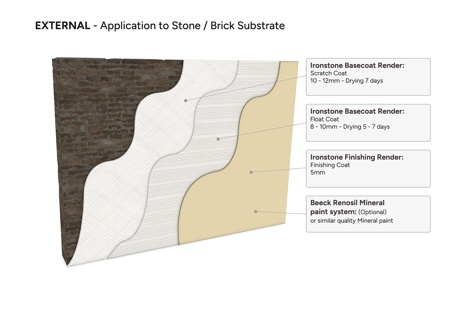 Further Coats: Ironstone Basecoat followed by Ironstone render or Ironstone plaster topcoat.